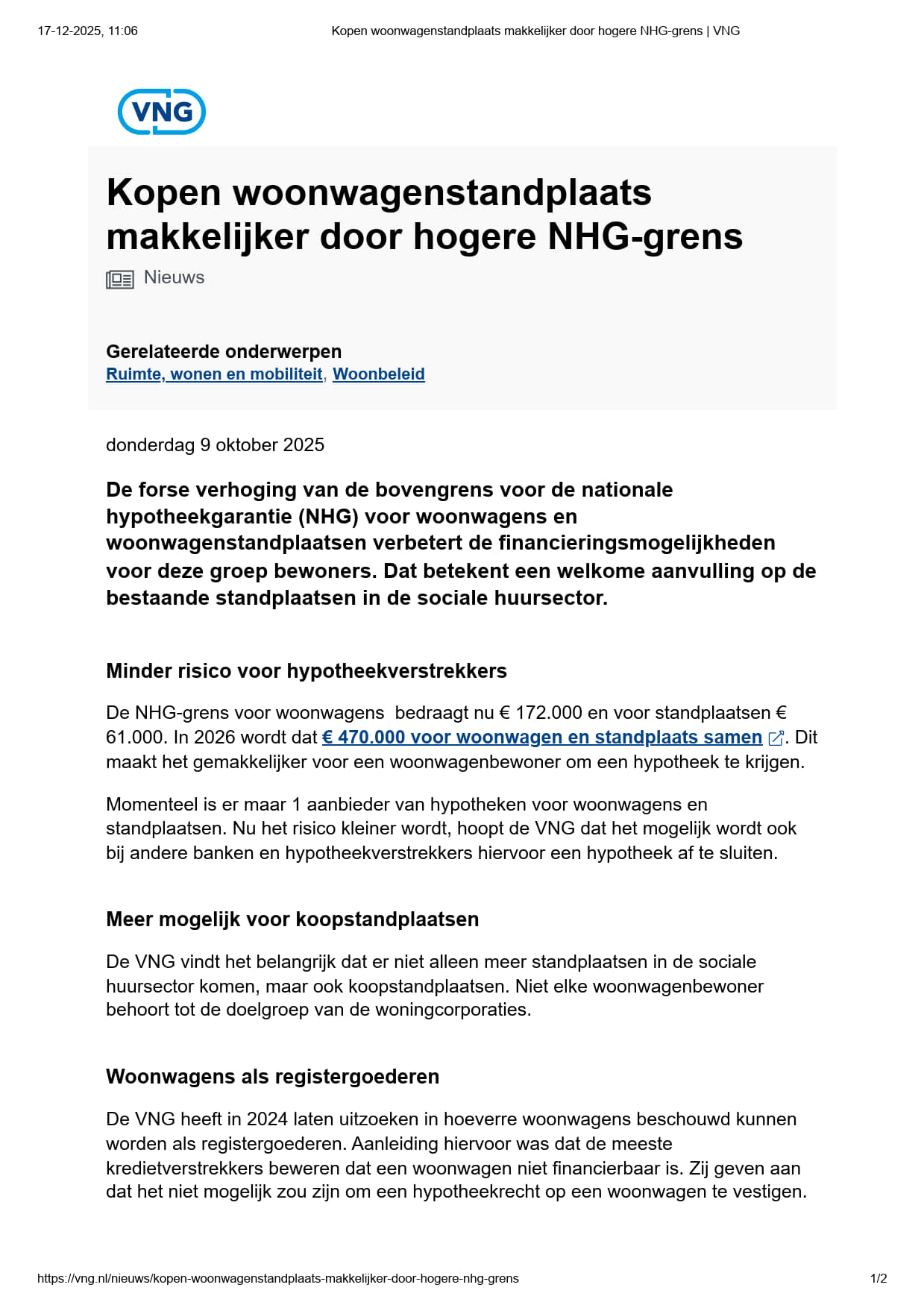 VNG Kopen Woonwagenstandplaats Makkelijker Door Hogere NHG-grens VNG 9 Oktober 2025